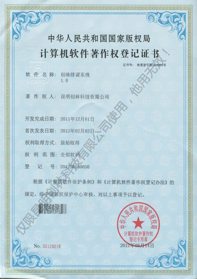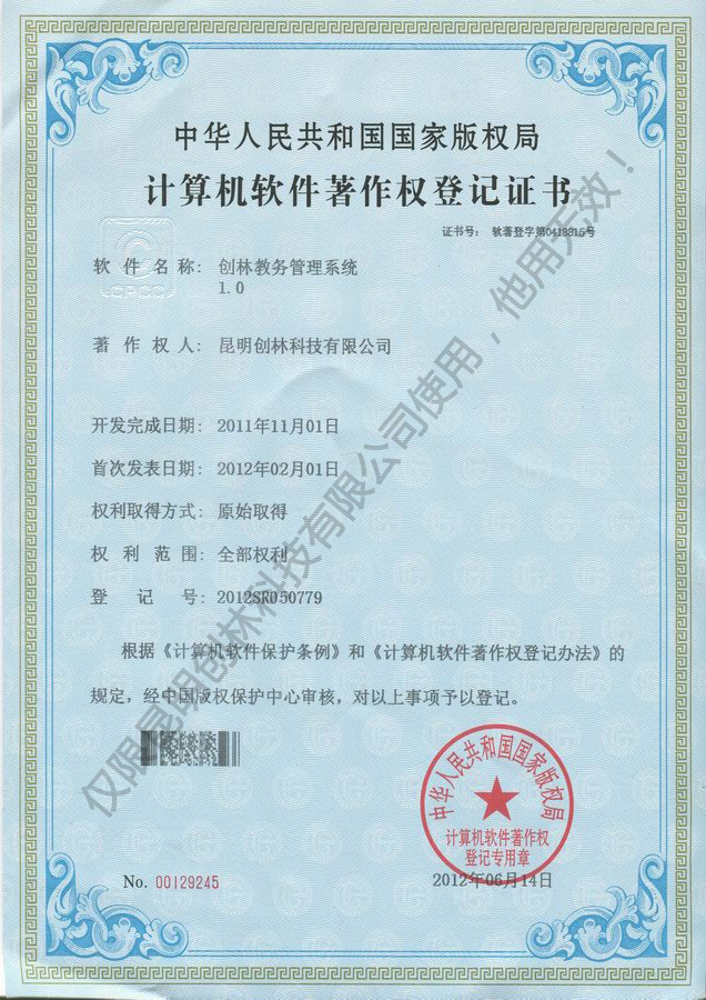教務(wù)管理系統(tǒng)軟件著作權(quán)登記證